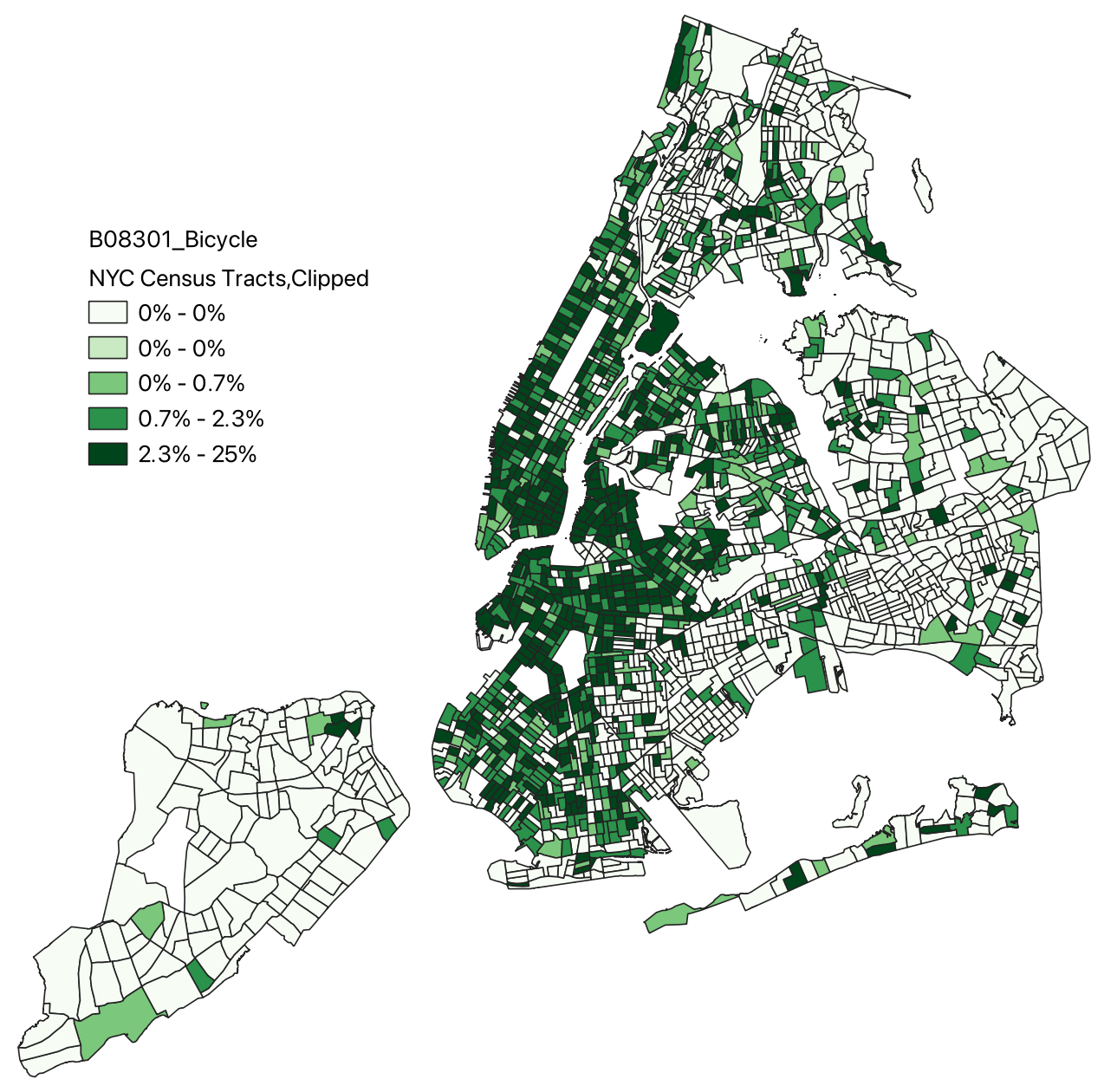 The American Community Survey asks respondents how they get to work. Biking is one of the choices! (You can only pick one, which hides some of what's really going on, like when people take the bus and the subway.) While the survey captures only a slice of total cycling, it's clear enough to show some patterns. We can see that certain neighborhoods have a higher rate of bike commuting than others.