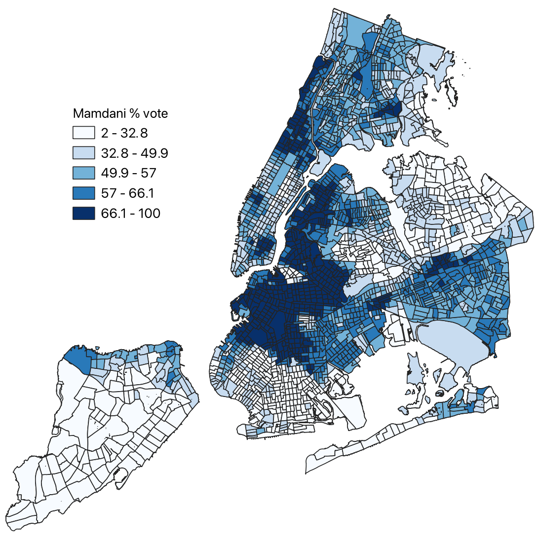 It makes sense that many bike commuters are either within Manhattan or near one of the East River bridges. However, plenty of bike commuters neither live nor work in Manhattan. If we look at Mamdani's support in this election, we can see that it has only a partial overlap with where bike commuters live.